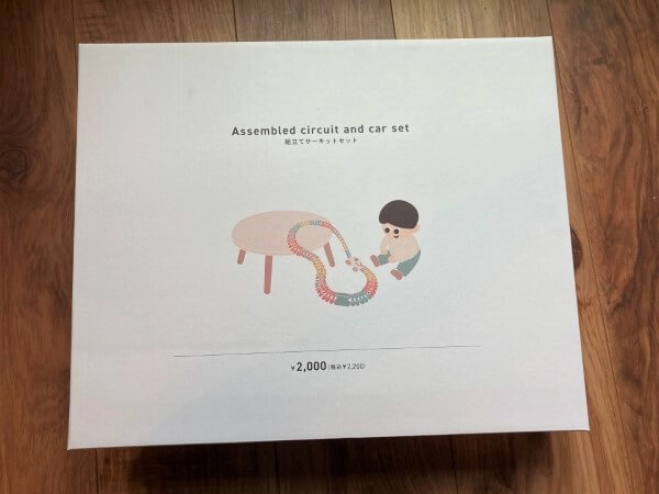 こちらがSNSで話題の「組み立てサーキットセット」(2200円・税込)。2000円商品だけあって、箱の大きさも横40cm近くと子どもが持つとけっこうな大きさです。
