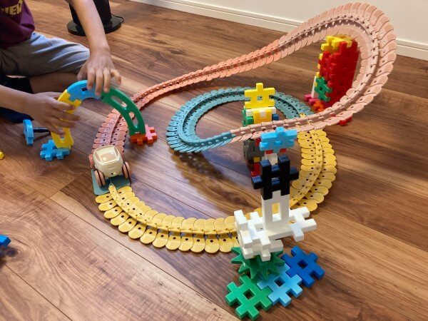 勾配をつけるために箱などを使っていましたが物足りなくなって持ってきたのが、手持ちの「ニューブロック」。コースの支えを作ったり、踏切や橋を作ったりと、創造力豊かに遊んでいました。