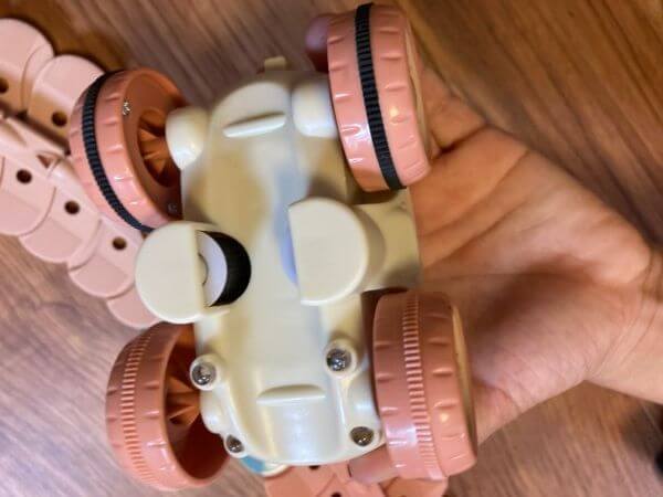 車をひっくり返してみると、両サイドにゴム製のベルトがついており、この部分がコースの中央にあるでっぱりをしっかりホールドして進むから、急なコースでも落ちずに走れるんですね。