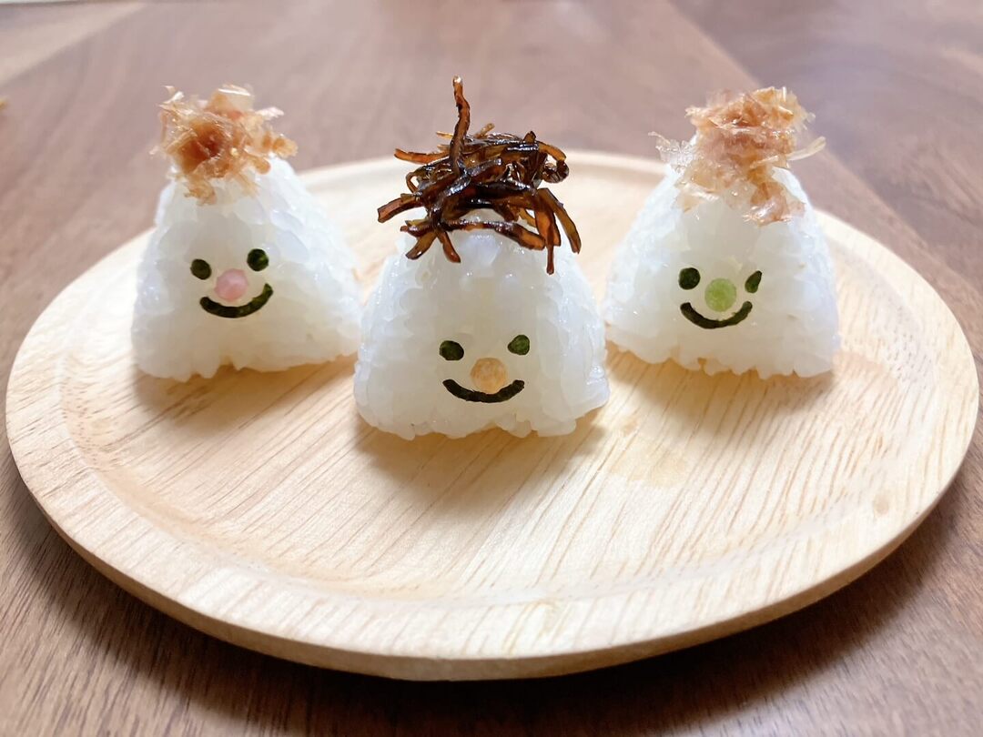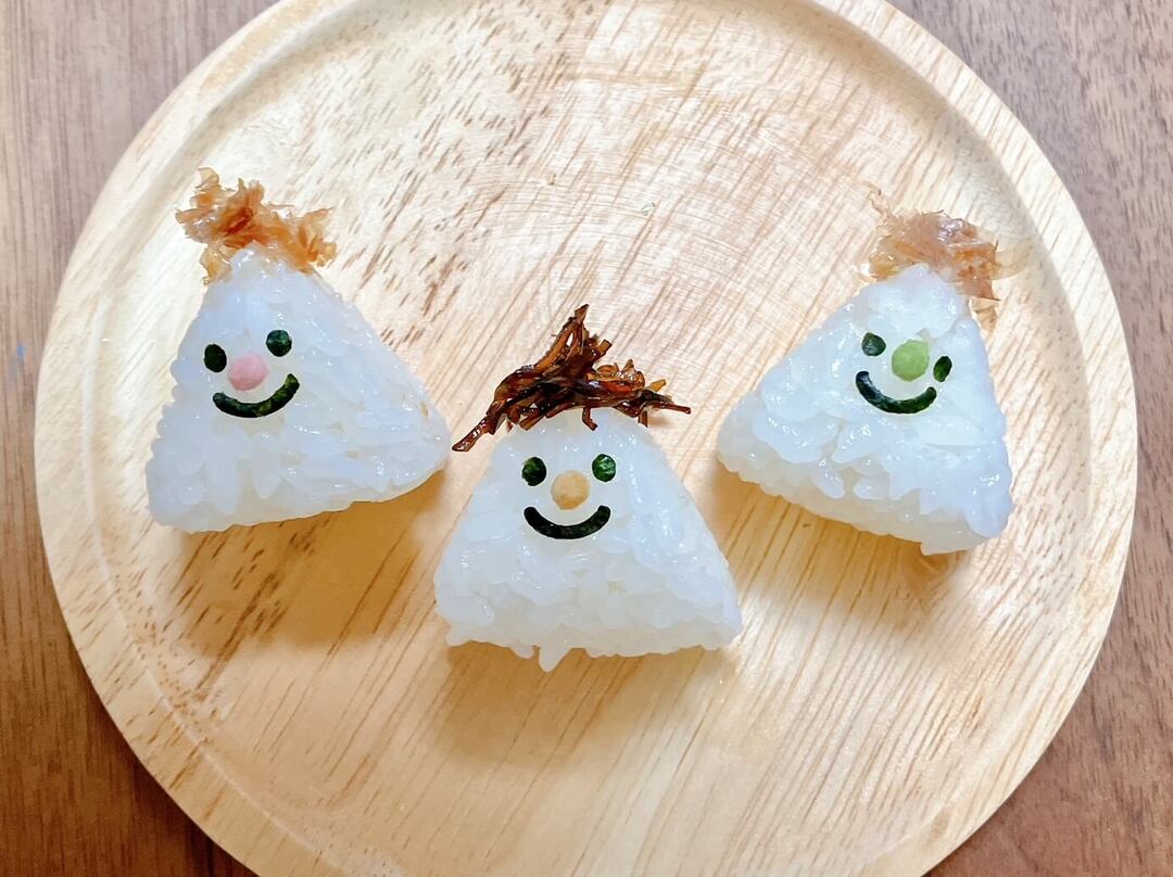 三角のてっぺんにかつお節や昆布をのせて髪の毛風にすれば完成!100均で手に入るぶぶあられを鼻にしてもかわいいですよ♡