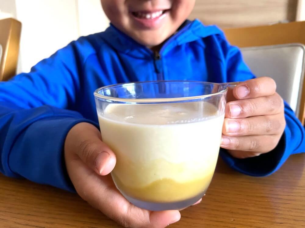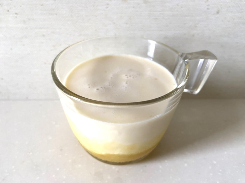 ちょっと見た目にこだわるなら、グラスの底にフローズンマンゴーを少量入れてから、牛乳を注いで2層にします。ミキサーを出さなくてもフローズンマンゴーを解凍すれば柔らかくなめらかなので、スプーンで混ぜるだけで手間もかかりません。
