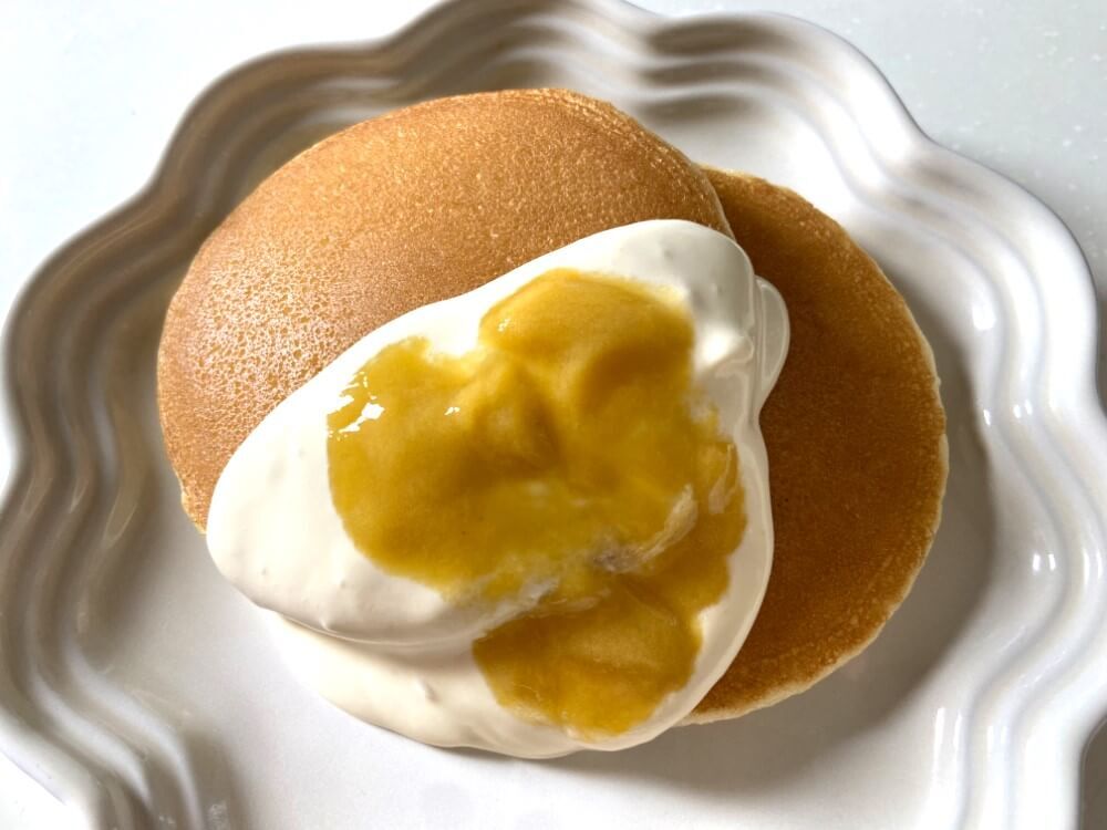 クリームチーズにフローズンマンゴーを加えて混ぜ、パンケーキにトッピング。仕上げに解凍したフローズンマンゴーをさらにフルーツソースのようにかけました。