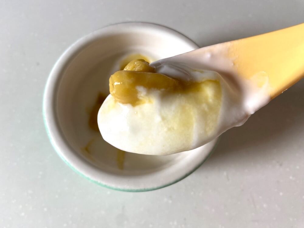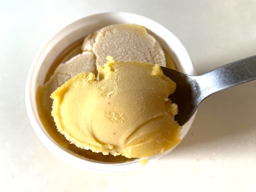 少し常温においたフローズンマンゴーにスプーンを入れていただきます。最初は少し固いですが、数分置くとすぐに柔らかくなってきます。