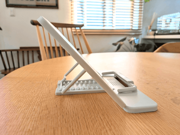 角度を調整したら前面にあるバーを持ち上げ、本やタブレットを置いて固定すれば準備完了!厚みが約2.8cmある本も、問題なく乗せることができました。