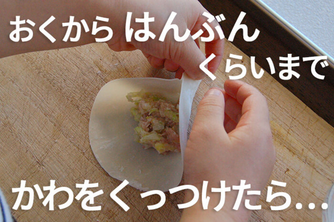皮の縁に指で水を一周つけ、真ん中にあんを大さじ1くらいのせます。皮を一か所つまんでくっつけ、中心くらいまで皮同士をくっつけていきます。