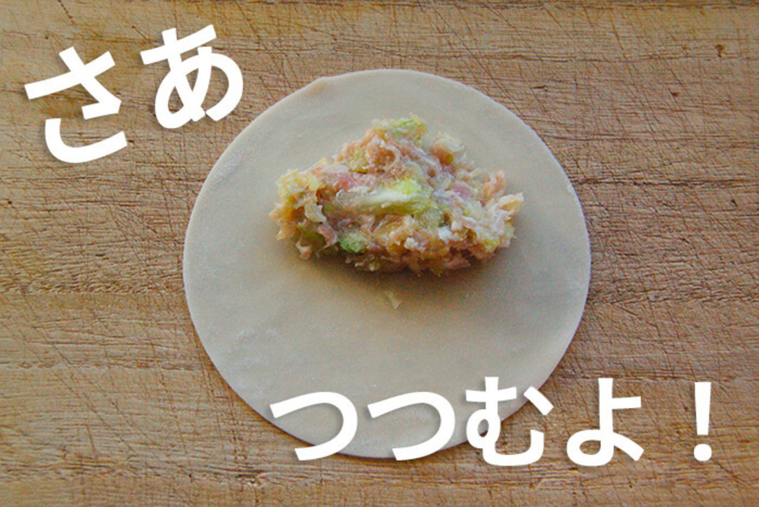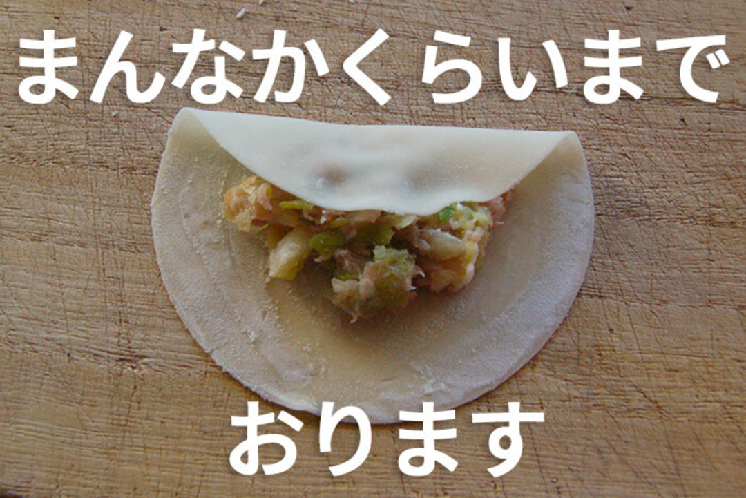 3.餃子の皮のふちに水をつけ、あんをのせて包む。