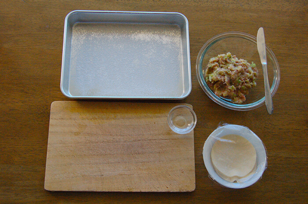 用意するのは、まな板など、皮を乗せる台、皮につける水、あん、皮、そして、包んだ餃子を乗せるバットや皿です。のせた餃子がくっつかないように、バットにうすく小麦粉をまぶしておきましょう。