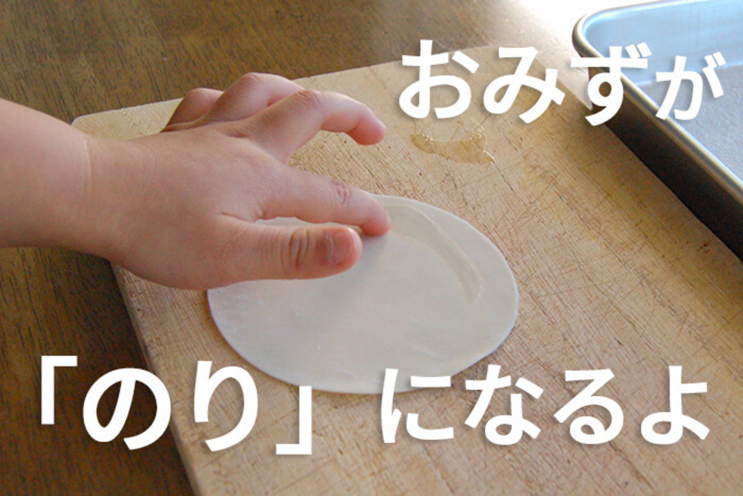 皮の縁に指で水を一周つけ、真ん中にあんを大さじ1/2くらいのせます。あんをのせるのは大人が担当してください。