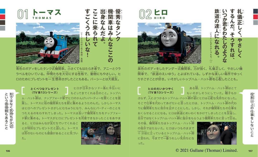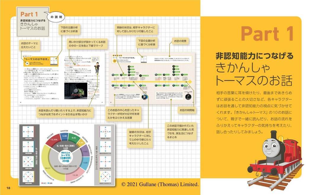 本書は2018年6月から2019年5月に実施された東京学芸大こども未来研究所と株式会社ソニー・クリエイティブプロダクツによる『きかんしゃトーマス』と非認知能力の関係についての共同研究成果に基づいたもの。非認知能力の観点から選定した10のお話と74のキャラクター図鑑で構成されています。