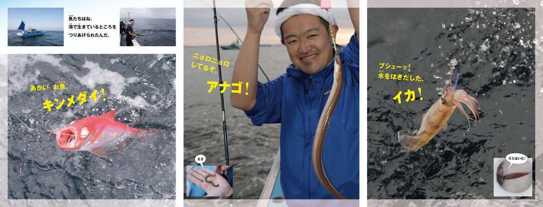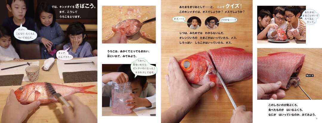 赤い魚「キンメダイ」、ニョロニョロしてるぞ「アナゴ」、腕がいっぱい「イカ」の全3章より構成されていて、それぞれ釣り上げた魚をさばき、お寿司になるまでを途切れなく写真で見せてくれます。