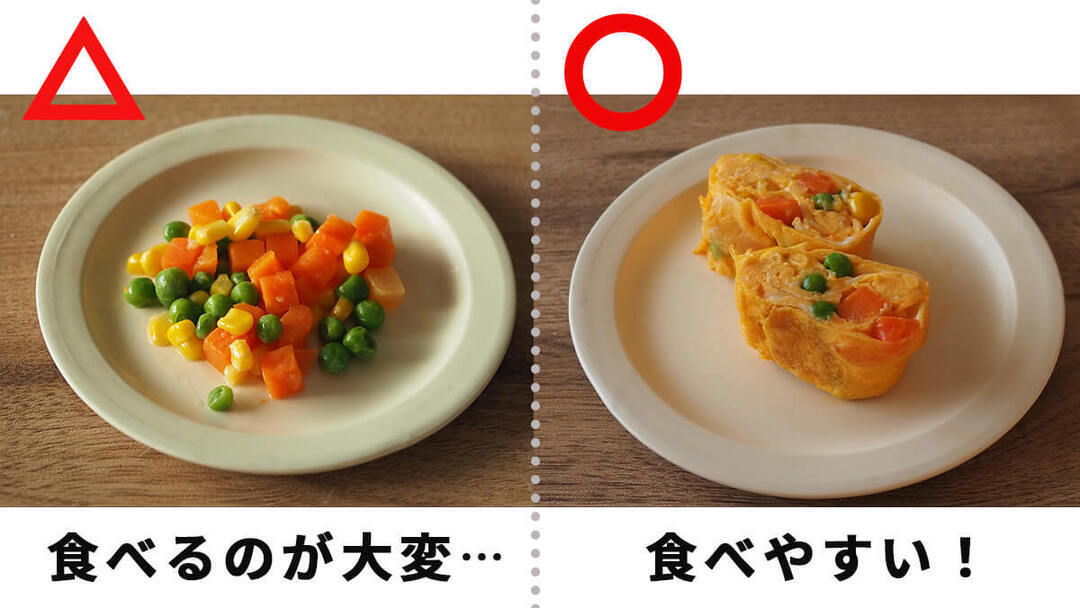 また、彩りを添えるのに便利なミックスベジタブル。これも幼児が食べるのは大変です。