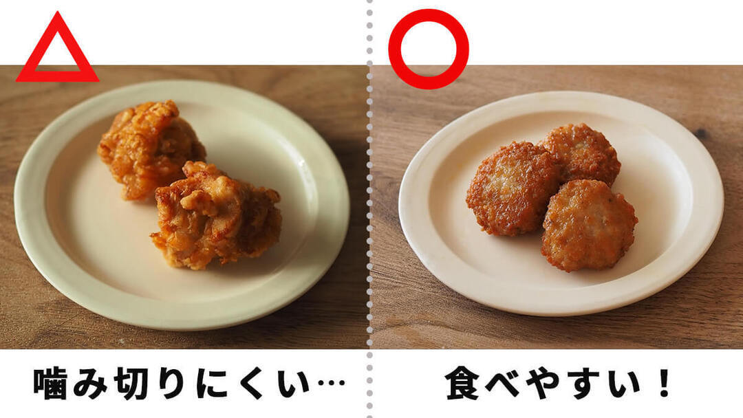 たとえばお弁当の人気おかず・唐揚げも、冷めるとどうしてもかたくなりがちです。 おすすめはひき肉を使ったおかず。チキンナゲット、ハンバーグ、肉団子、つくねなど冷めても比較的柔らかく、噛み切りやすいので、幼児のお弁当のおかずに向いています。