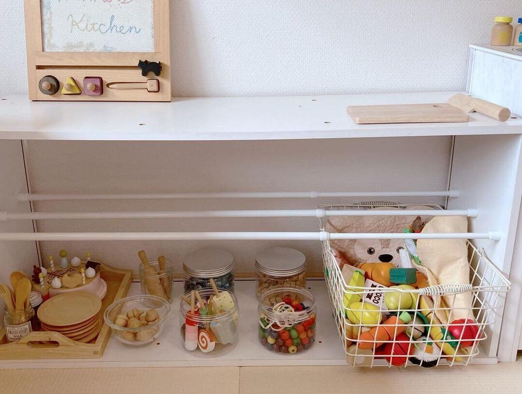 成長に合わせて収納も変化させたい…だけどそのたびに買い替えるのではなく持っているものを有効活用したい、という方におすすめ!こちらは【セリア】のつっぱり棒3本をカラーボックスに設置。その上に、ホームセンターでカットしてもらった板を乗せて簡単DIY☆おままごとグッズがお店のようにとっても見やすく並んでいます。
