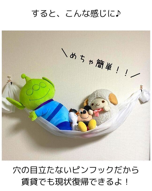 穴跡が目立たないピンフック、ヘアゴム、ひもを使って、ハンモックの完成!見た目もかわいく、大きなぬいぐるみも収納できちゃうのがうれしいですね。