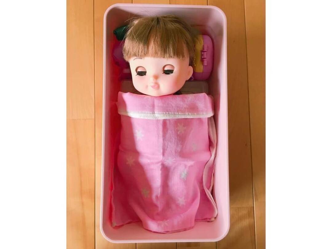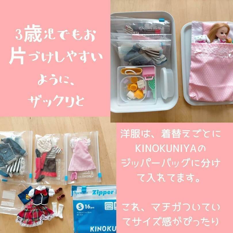 ワンセットずつ小分けにしたお人形の洋服をジッパーバッグに入れ、100円ショップの収納ケースにお片付け。しかも、そのふたをベッドにしてお人形が寝ているんです♡これならお人形遊びの延長で楽しくお片付けもできちゃいますね!