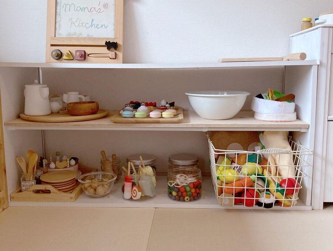おままごとの食材が一目瞭然!お店屋さんのような雰囲気のこちらの収納棚は、【セリア】のすのこ、板、正方形の細い棒を使った棚に、木箱を組み合わせてDIYしたもの。おままごとも、お店屋さんごっこも、お片付けも楽しくできて、子どもたちもテンションUPしちゃいそうですね!