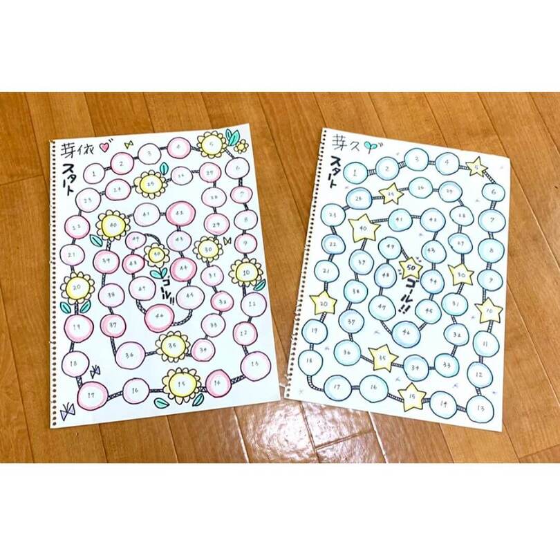 双子のお子さん用の手描きのかわいい"トイトレ"シール台紙。50回できたらゴールですが、注目は5回成功するごとにお花、星のスペシャル枠があること!目の前に小さな目標があるとやる気もUPしますし、小さな成功の積み重ねが大きな達成感につながりますね。