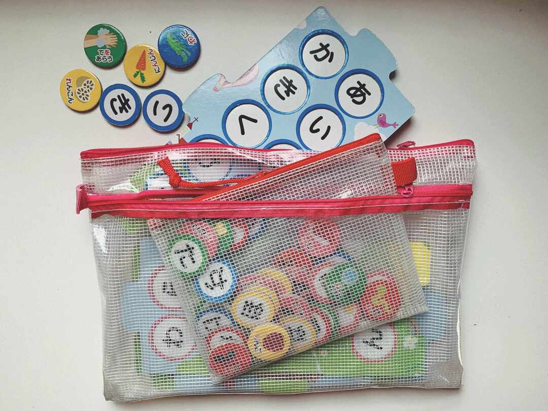こちらはネットケースの2個使い。バラバラになって足りなくなってしまいがちなひらがなの練習パズルの収納に活用。
