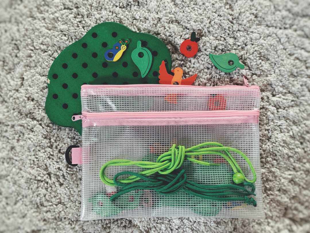 こちらは、紐通しのおもちゃをネットケースに収納。通すパーツをメインポケットに、紐をサブポケットに入れてスッキリ収納。 どんどんパーツが減っていく…という残念なことが起きないよう、遊んだらここに入れる!を子どもにも習慣付けしたいですね。