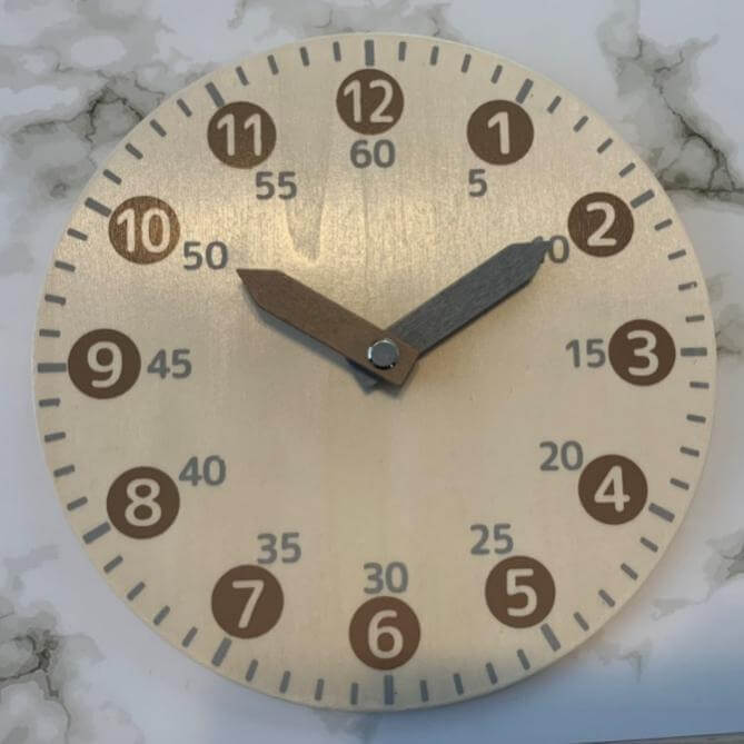 ふだんは何分かを数えるところで悩んでしまいパッとは言えないのですが、文字盤にどの数字が何分かが書いてあるため、簡単に答えることができました。