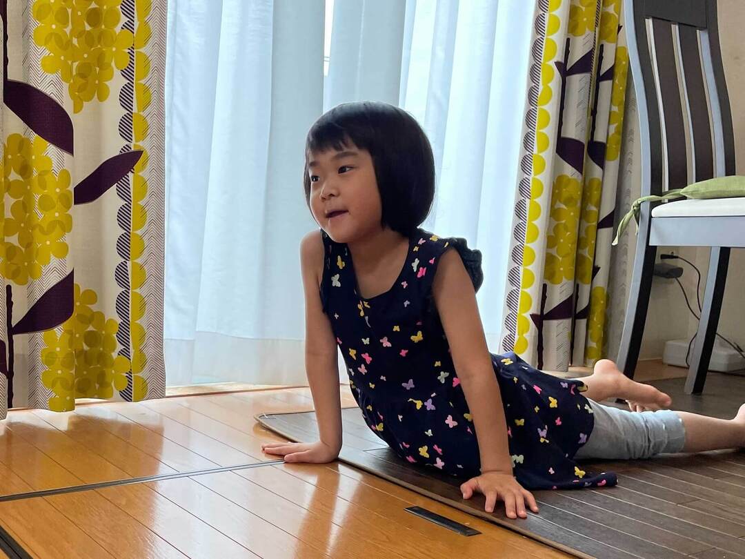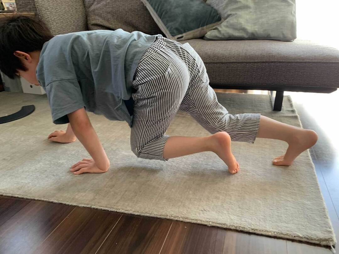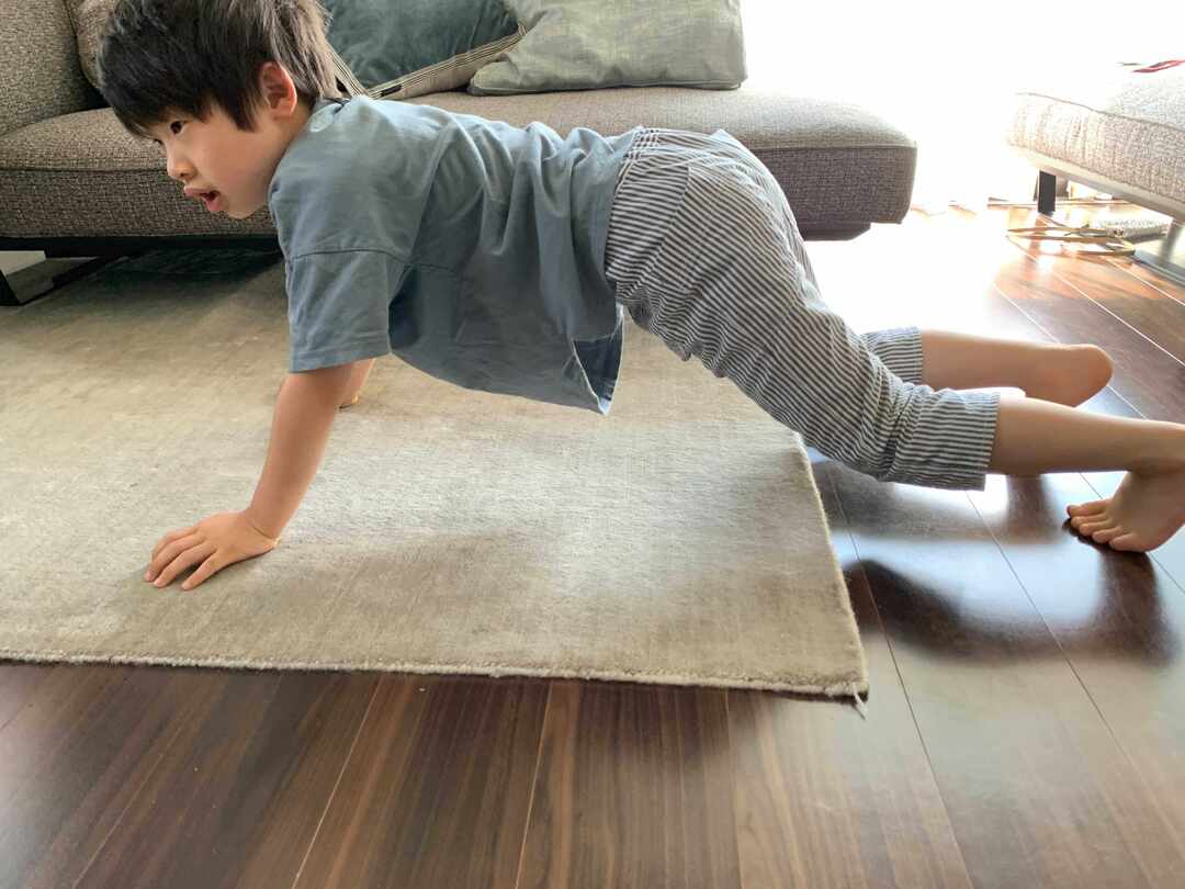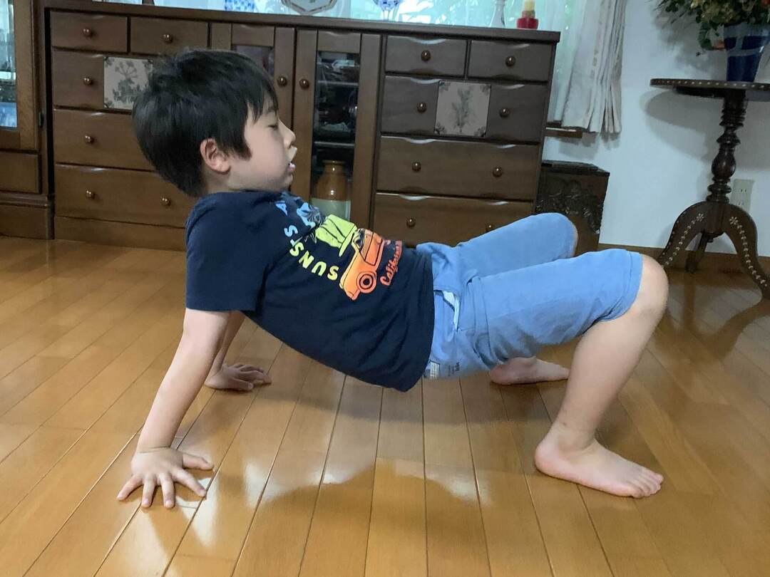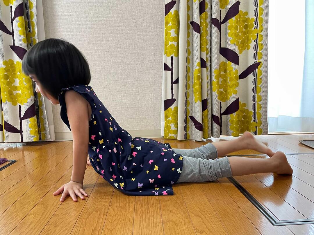 腕の力が足りないと、お腹を上げるのに若干、苦労するかもしれません。「おなかは床につけちゃダメだよ」と促してあげるといいでしょう。
