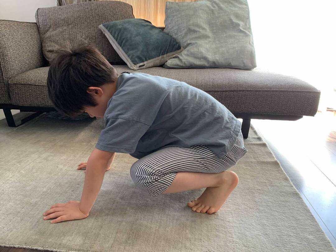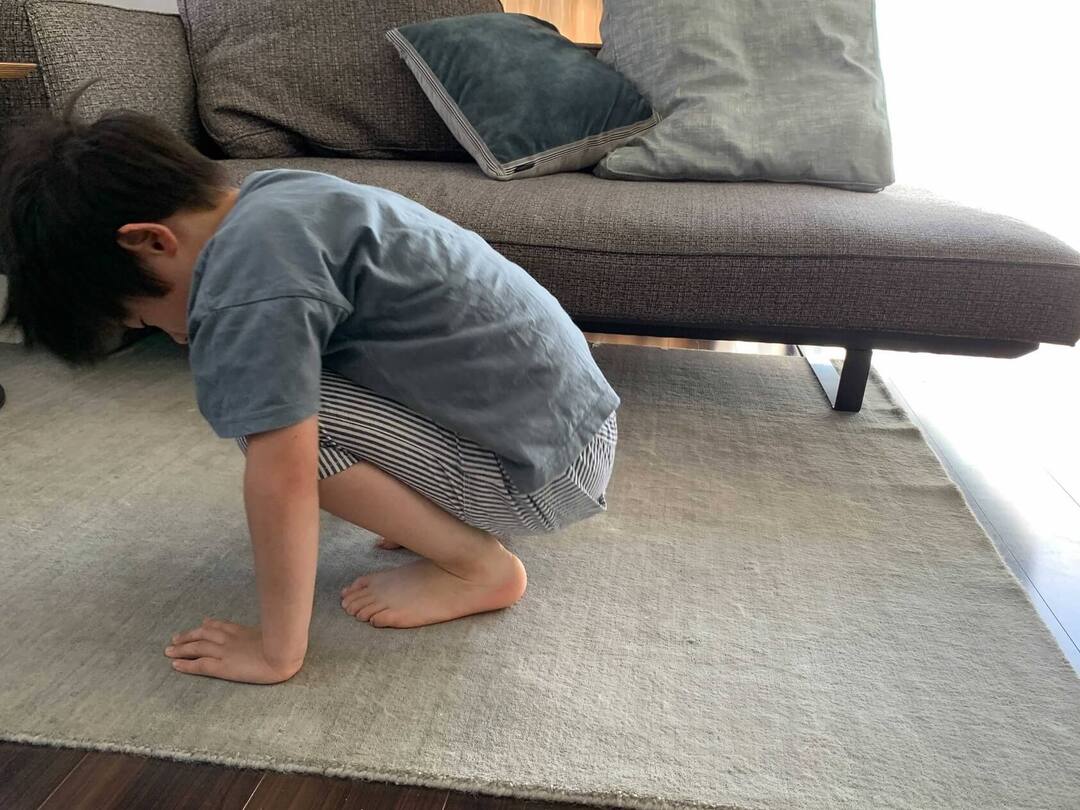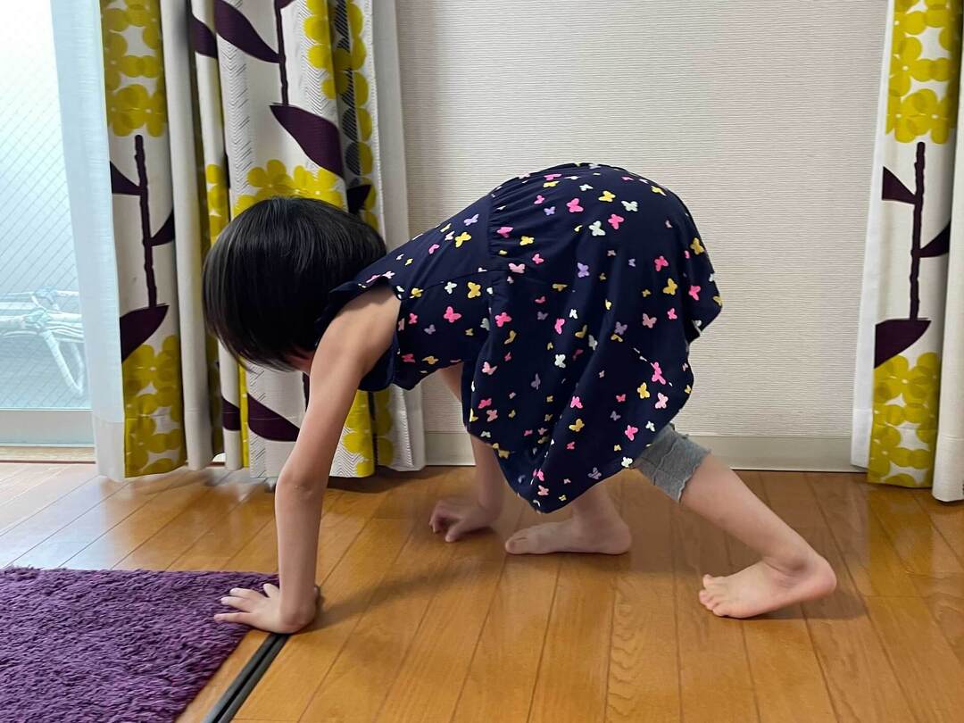 手と足を一緒に動かしてしまいがち。「手が先だよ」「手をついてぴょん、手をついてぴょん」など教えてあげてください。