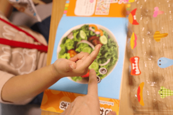 うちの子は、色とりどりのおいしそうな食べ物の写真や絵を見て、貼る前からテンションが上がっていました。