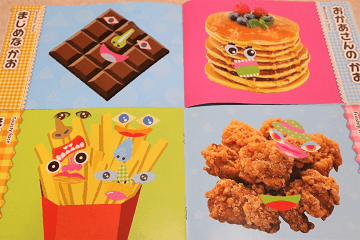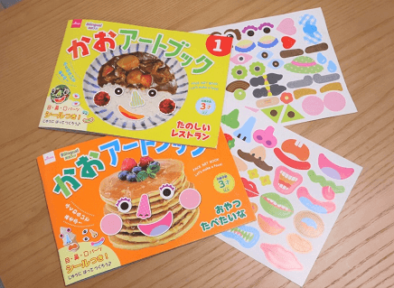 さまざまなラインナップがある「かおアートブック」。今回はレストランメニューが顔ベースの①とおやつが顔ベースの②で遊びました。