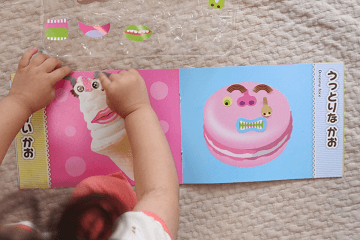 まだイヤイヤ期の名残があるうちの子。途中で飽きて壁に貼ってしまいそうだなと思っていましたが、食べ物に顔パーツを貼ることにおもしろさがあったのか、集中して「かおアートブック」にシールを貼っていました。