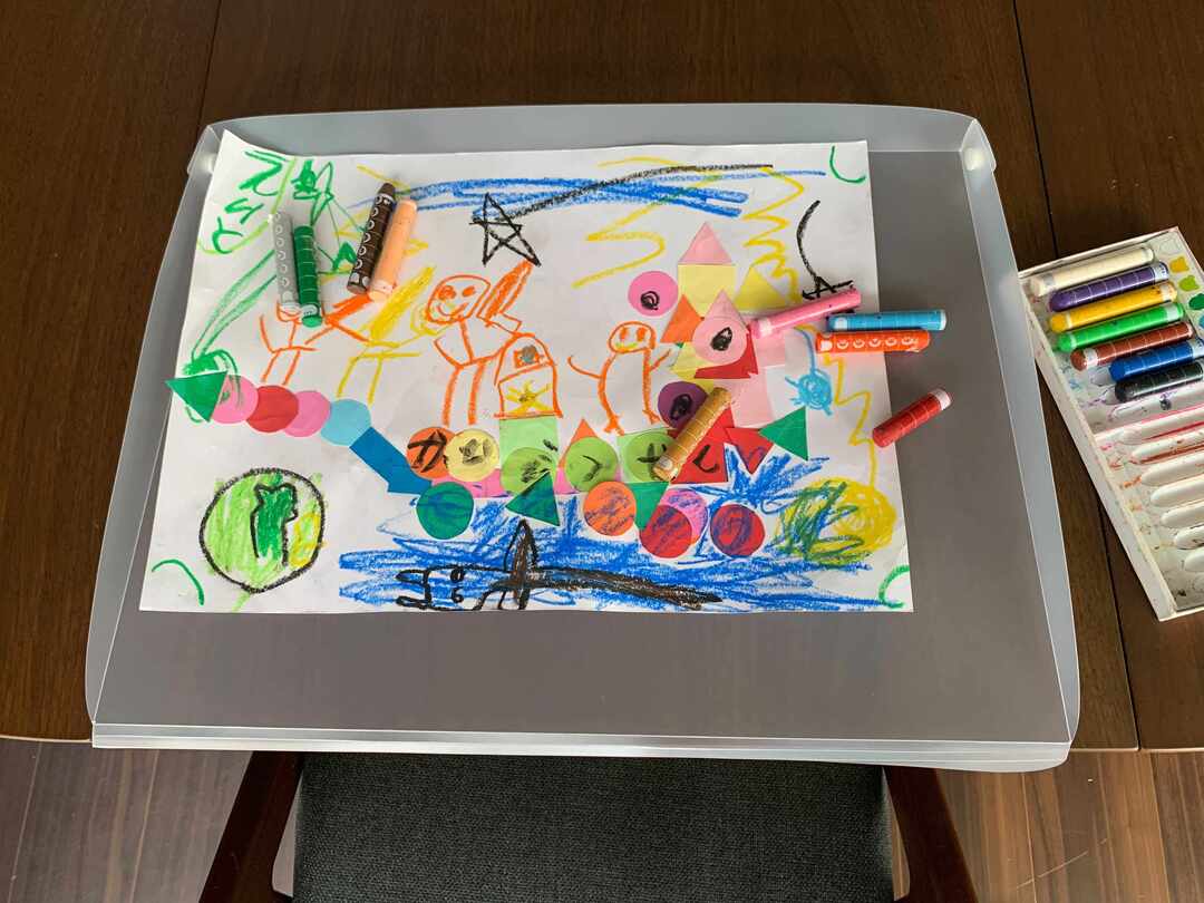 幼児だとお絵描きでクレヨンを使うとき、紙からはみ出して描いたり、たくさんのクレヨンを箱から出して机に置いて汚れたり、はたまた裏面に描いたときに机に写ってしまったり…で何かと汚れがち。