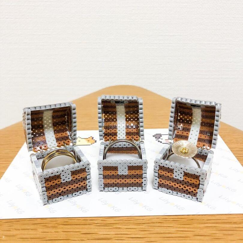 ゲームに出てきそうな宝箱型のリングケースは、ハンドメイド作家のlily.kgさんの作品。通常よりも小さいサイズの「ナノタイプ」のアイロンビーズで作られたものだそう。