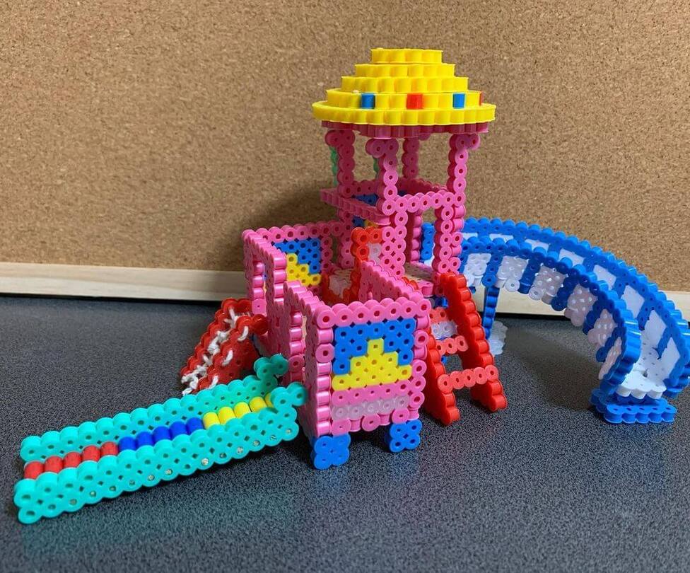 すべり台のカーブやネットの網目など、楽しい雰囲気の中にもアイロンビーズの技術が光る作品は、ずっと眺めていられそうです…!