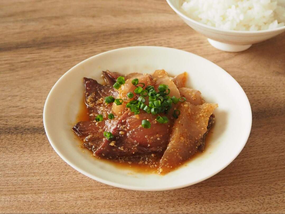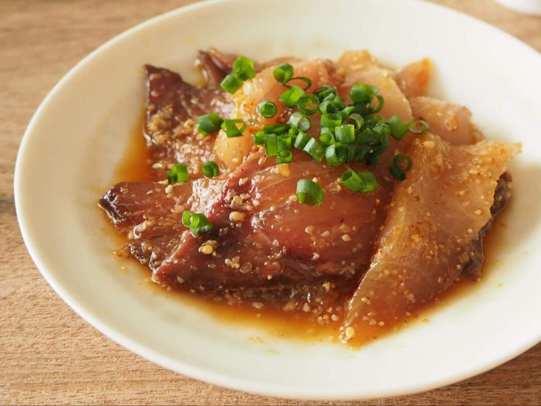 ぶりを薄くそぎ切りにして、しょうゆと煮切ったみりん、すりごまを混ぜたものに漬けて15分ほど置きます。小口ぎりのねぎをのせて完成。