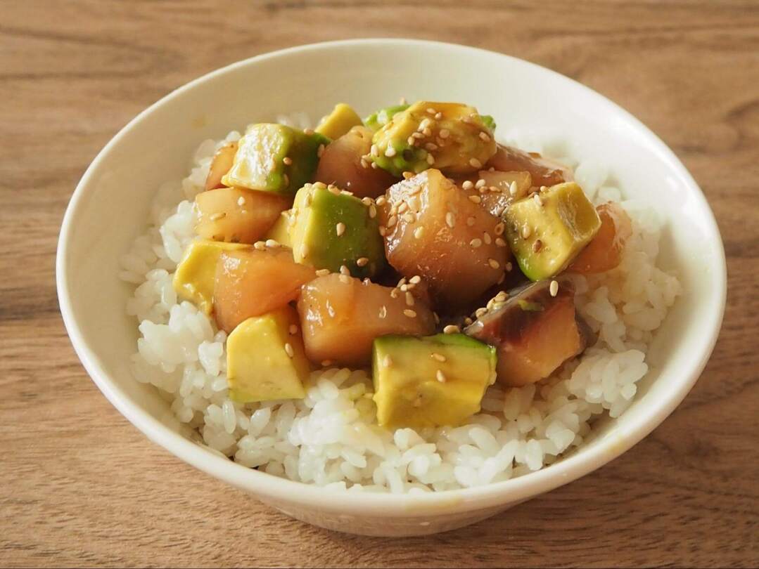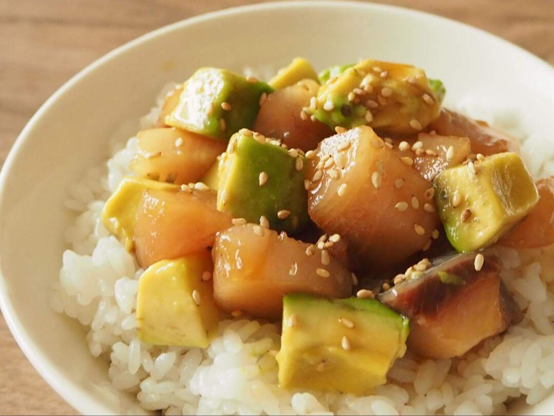 まずは生でおいしく味わえるメニューから。まぐろで作ることの多いハワイのポキ丼をぶりで作りました。ぶりには彩りと味の相性の良いアボカドを合わせてみました。しょうゆベースのたれにごま油、いりごまを合わせてぶりとアボカドをさっと和えてごはんの上にのせるだけ。