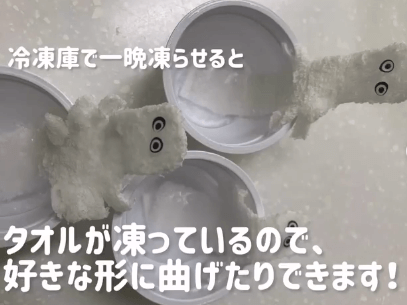 タオルは凍った状態で好きな形に曲げることができます。後ろに反って凍っているニョロニョロの体を起こしてあげましょう!