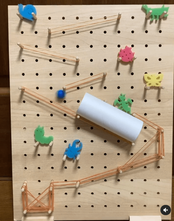 ダイソーのデザインボードにダボを差し込み、輪ゴムでルートを作ったら、「ピタゴラスイッチ」でおなじみの、ピタゴラ装置が簡単に完成!玉が落ちてこないように、少しボードを傾けているのがポイントだそう。ゴール部分は、輪ゴムをクロスさせて、落ちないように工夫してあります。