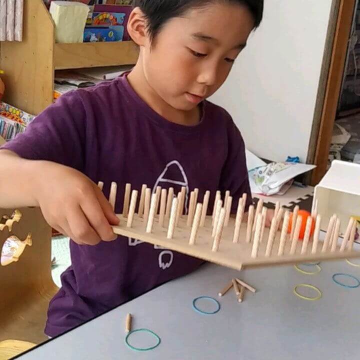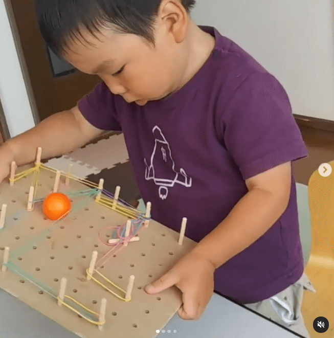 弟は輪ゴムとダボを使って…兄はダボだけで挑戦!と、子どもの年齢や発達に合わせて楽しめるのも、手作りおもちゃの魅力ですね。2人の真剣な表情からも、集中している様子が伝わってきます♪