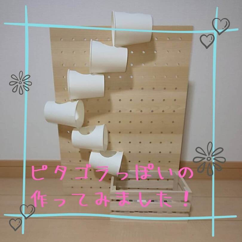 こちらはダイソーのデザインボードに、ダボ・紙コップ・木製ボックスを組み合わせて作ったビー玉転がし。材料はすべてダイソーで揃います!