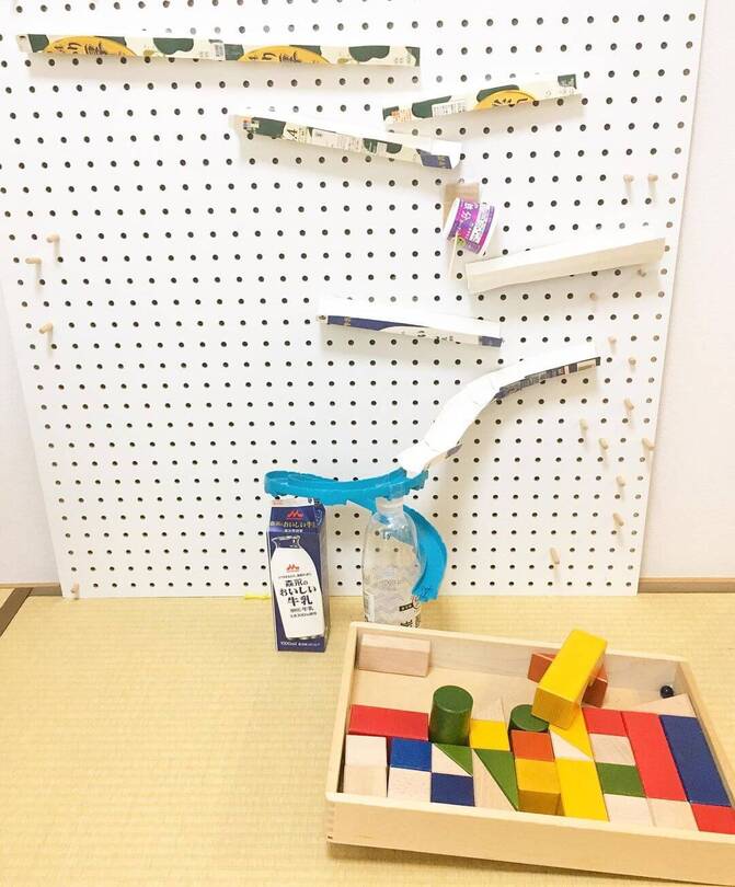 こちらはダボを土台にして、牛乳パックでルートを作ったピタゴラ装置。左右にルートを変えながらボールが進む様子は、目で追いたくなりますね。息子さんも夢中になって転がしていたそう。