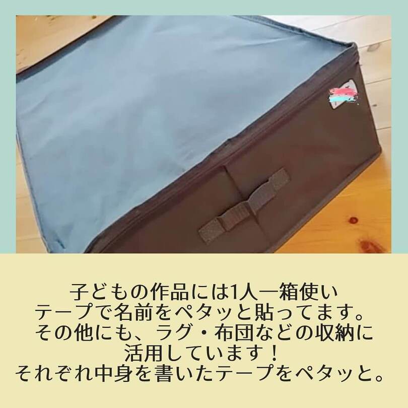 こちらは4人のお子さんがいるママのアイデア。ダイソーの「ベッド下収納ボックス」を使った思い出収納箱です。ダイソー商品ながら400円とちょっとお高めですが、布団やラグも入れられるほどの大きさで、たくさん思い出を取っておけますね。