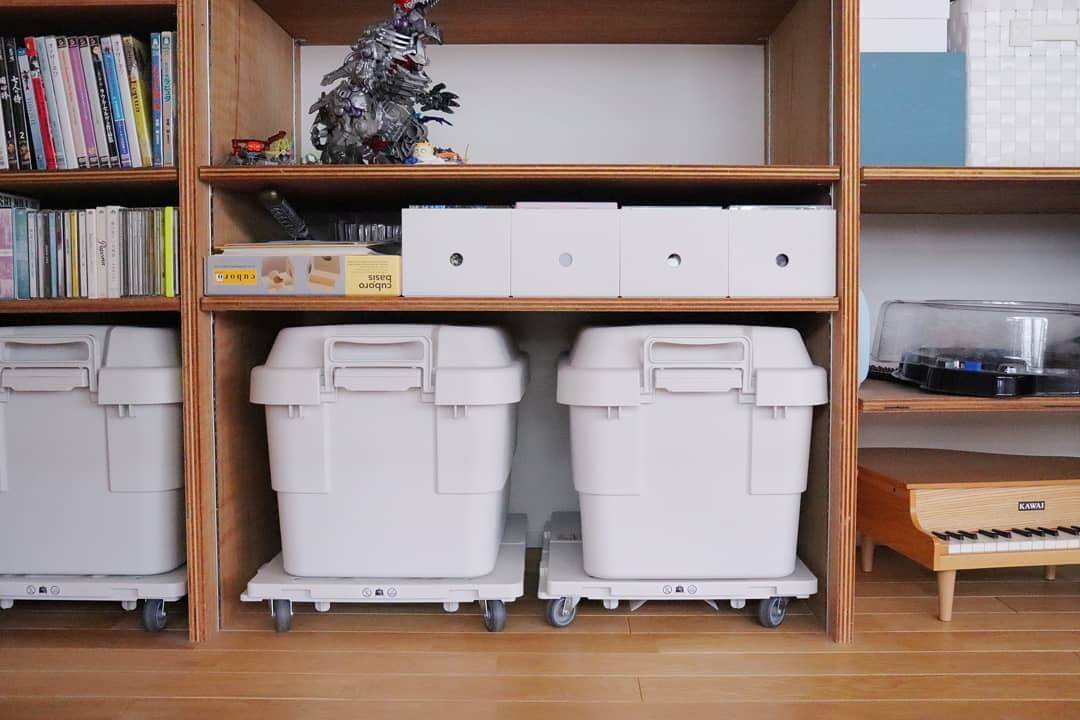 立体作品などの大きな作品は、無印良品の「ポリプロピレン頑丈収納ボックス」に入れて、取り出しやすいようにキャスターに載せてあります。これなら子どももすぐに引っ張り出して見れますね!