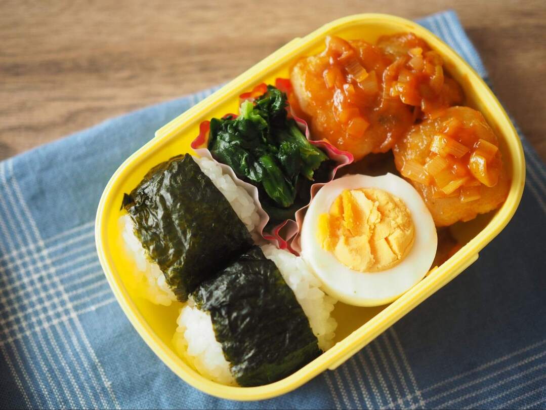 おにぎりとほうれんそうのソテー、ゆでたまごを付け合せに。ほうれんそうは冷凍のものを使い、ゆでたまごは前日にゆでておけば、楽ちんですよ。
