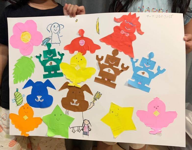 完成~!「テーマはよるのさんぽ、だよ!」と、テーマまでつけてくれました。きりえにも目や鼻を書いて、とても可愛い作品に♡