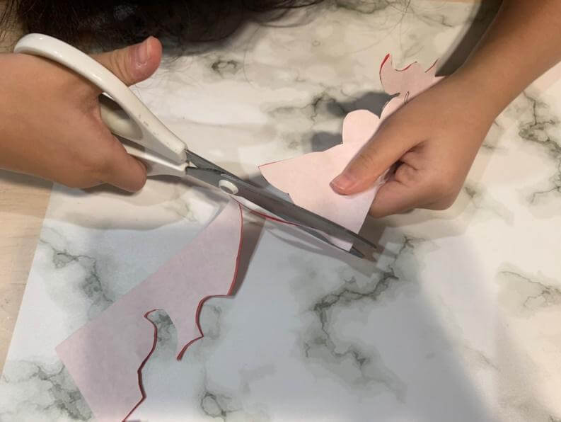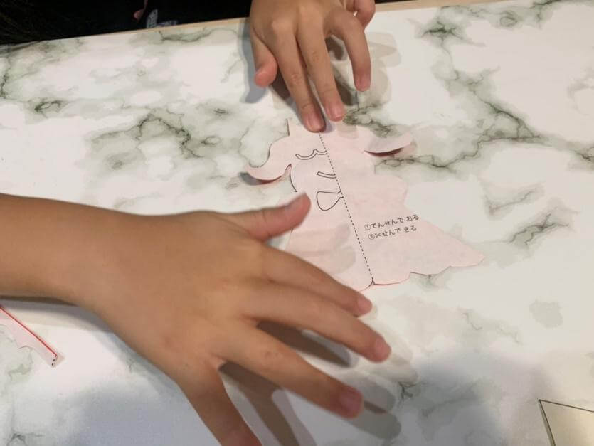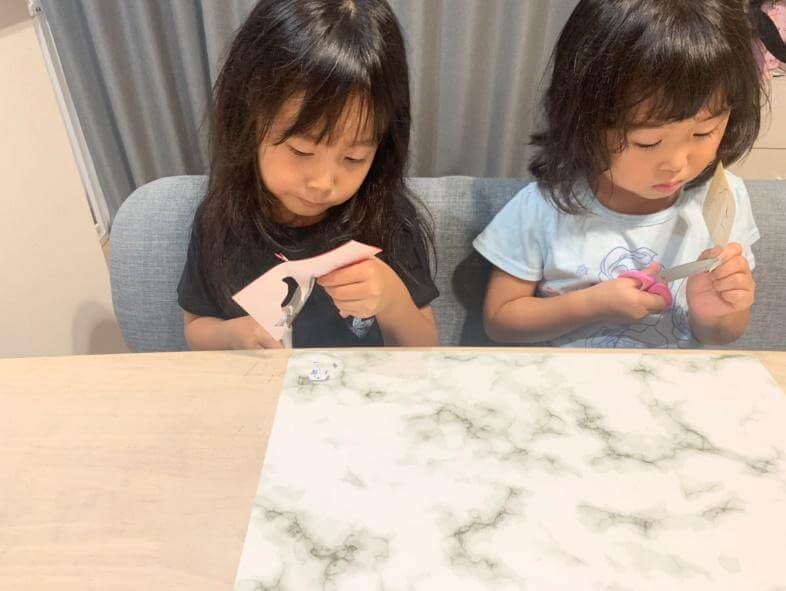 「はさみが大きくてちょっと切りにくい」わが家には子ども用サイズのはさみが1つしかなく、長女には大人用のはさみで切ってもらいましたが、少し切りにくそうでした。ここはやはり、子ども用の小さめのはさみを使った方がよさそうでした。