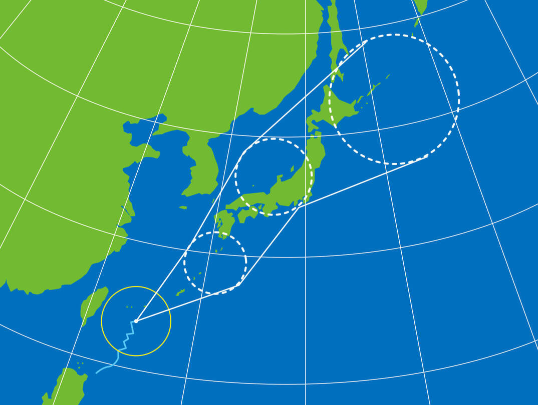 ▲台風が発生するとニュースや天気予報でよく出てくる進路図。進路と影響範囲を示している