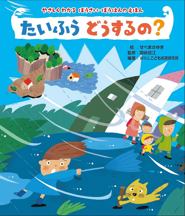 こちらは防災の絵本です。台風が近づくとどうなるの?から始まり、台風に伴う自然の恐ろしさについて、川の氾濫・土砂崩れ・避難のしかた・避難時の持ち物・雷が来たときの行動などが子ども向けに描かれています。