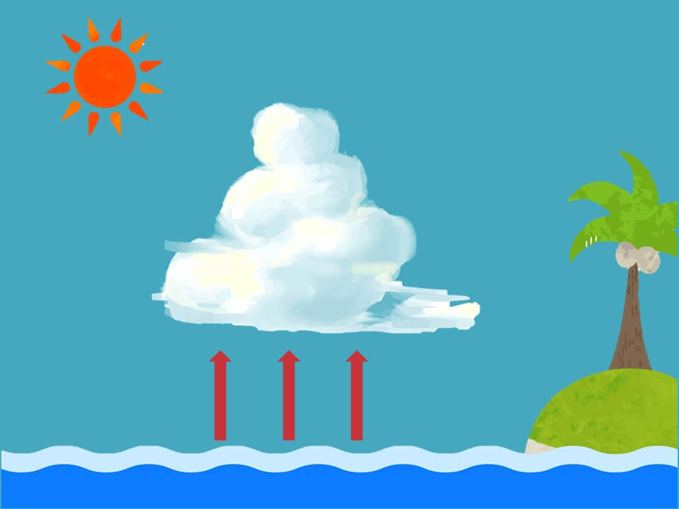 南のあたたかい海では、太陽の熱で海水温が高くなり、海水が水蒸気になって上空へ上がっていきます。上空では水蒸気が冷えてたくさんの「積乱雲(せきらんうん)」という雲ができます。