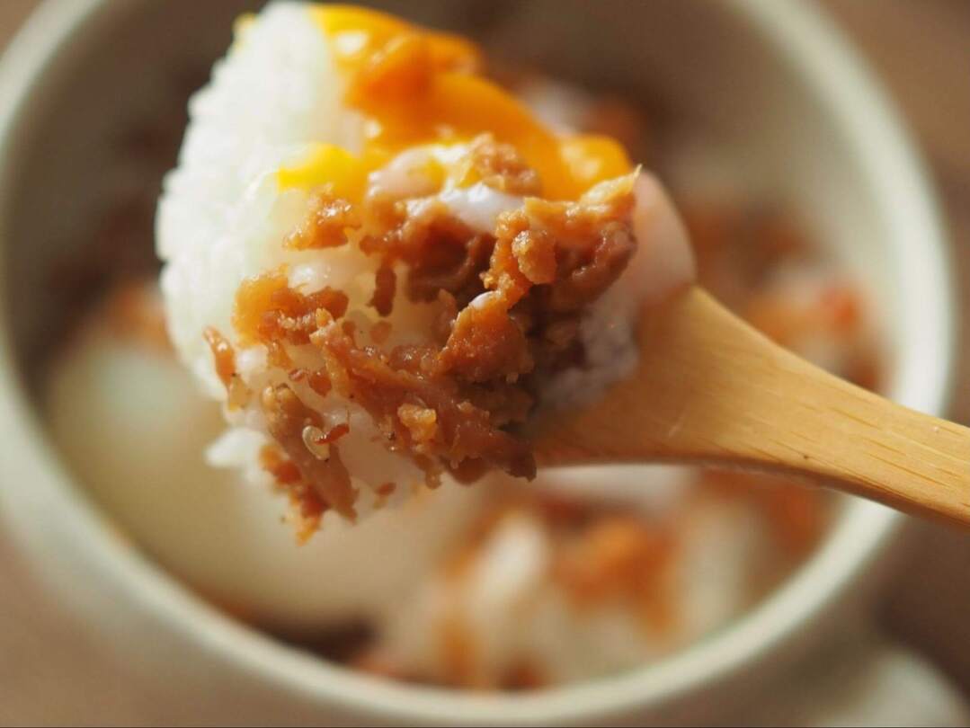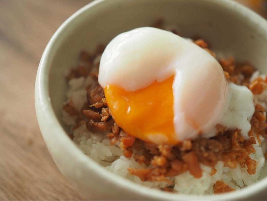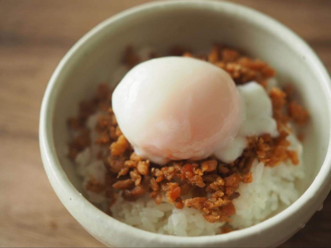 本当はたまごのそぼろを作りたいところですが、いそがしい朝なので、市販の温泉卵をのっけて完成!