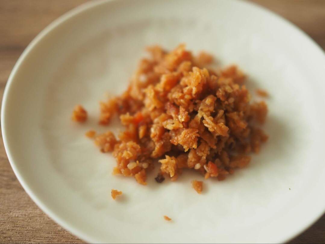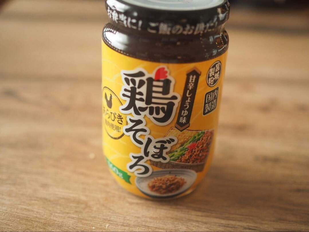 この鶏そぼろ、鶏肉のほか、ごぼう、にんじん、しょうがなど野菜も入って甘辛い味に仕上がっています。脂でかたまってるのかなーと想像していたんですが、ポロポロ。これは使いやすそう。