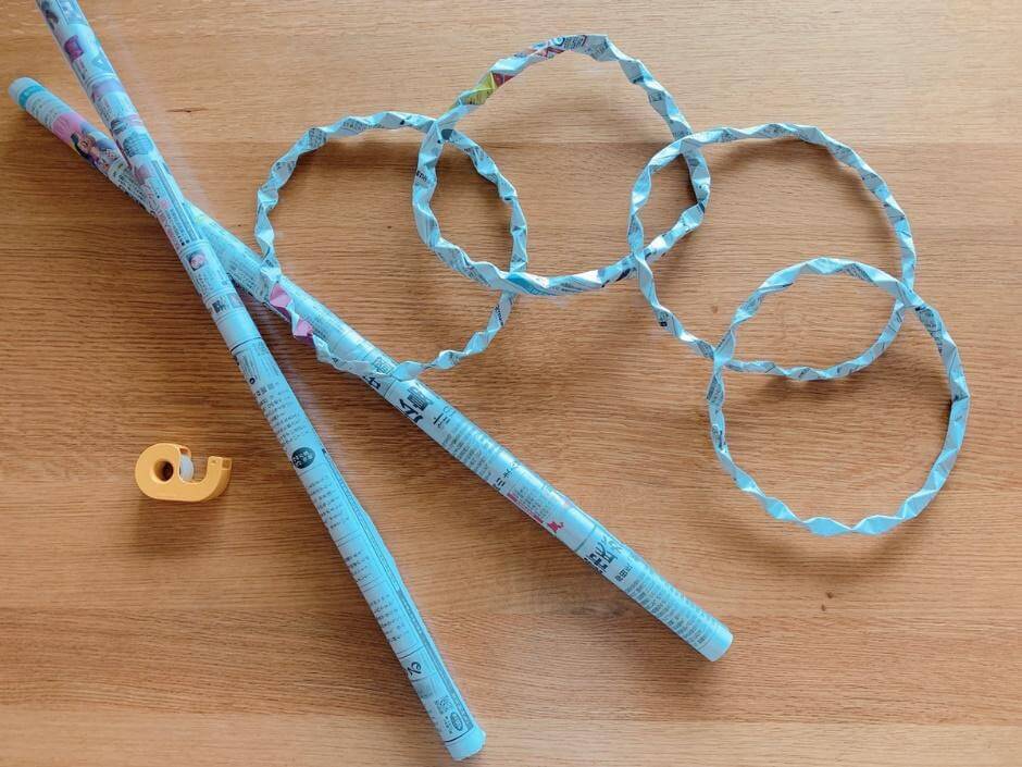 準備アイテムには新聞紙で作ったリングやスティック、ボールなどがあり、サイト内で作り方が丁寧に動画解説されているので、こちらもぜひチェックしてくださいね。